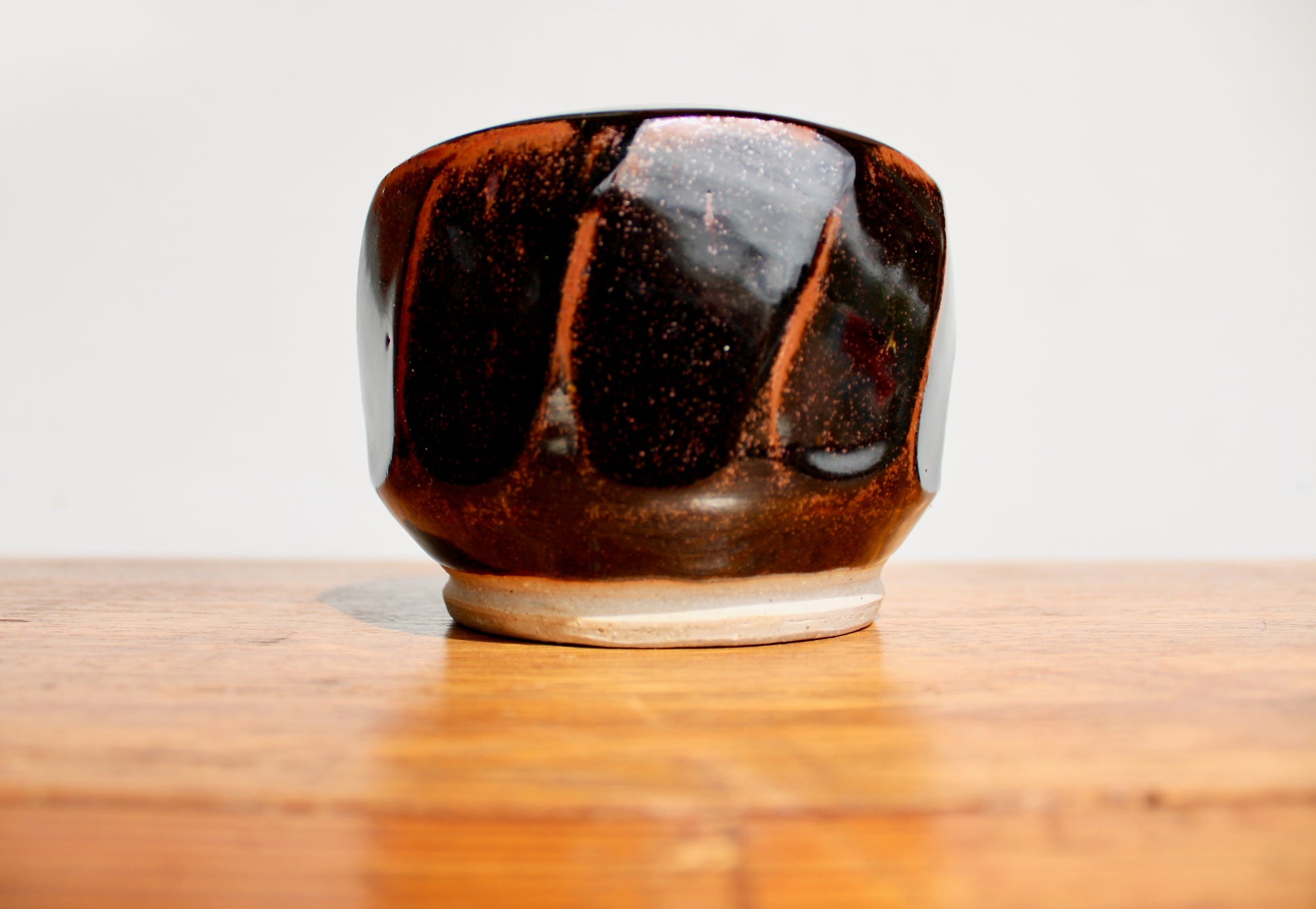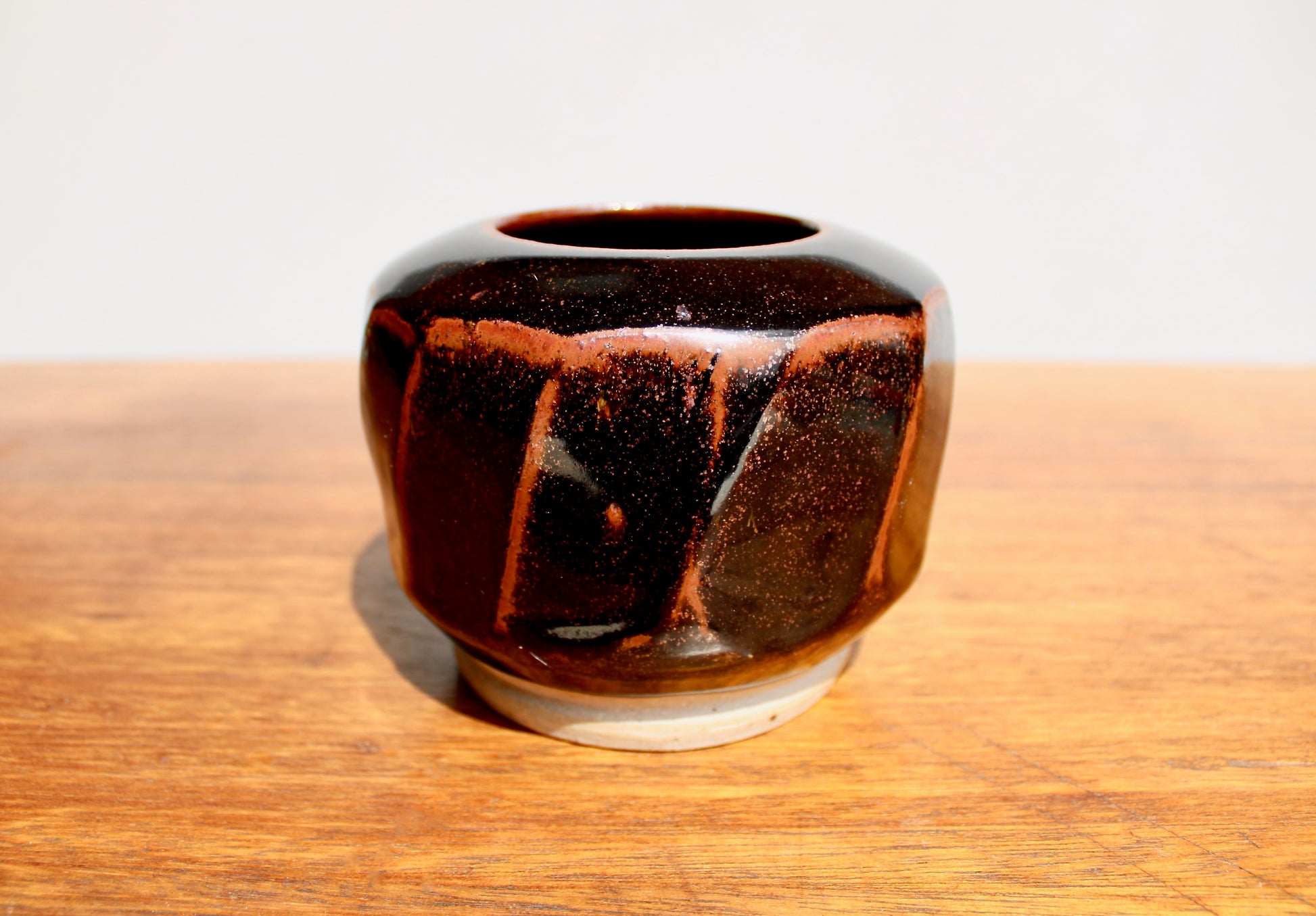 AI Stoneware Vessel Tenmoku Glazed Faceted Sides, Signed AI, Vtg Handcrafted Studio Pottery