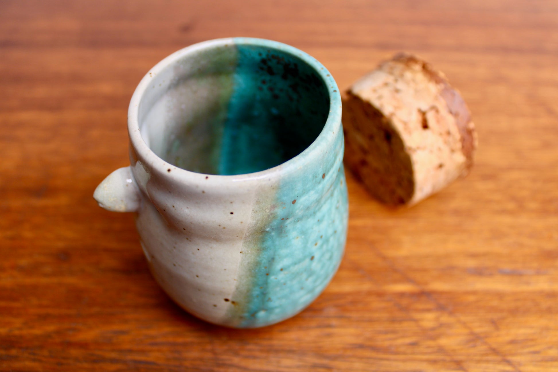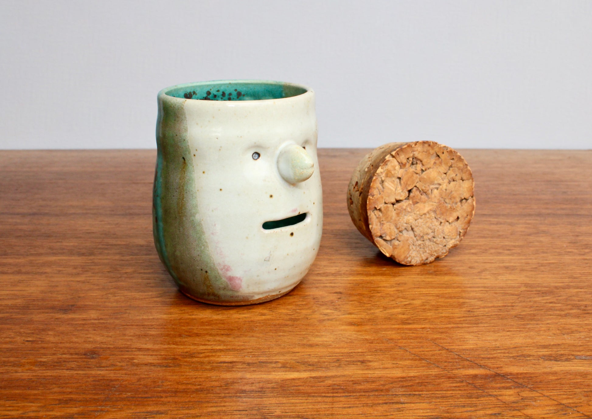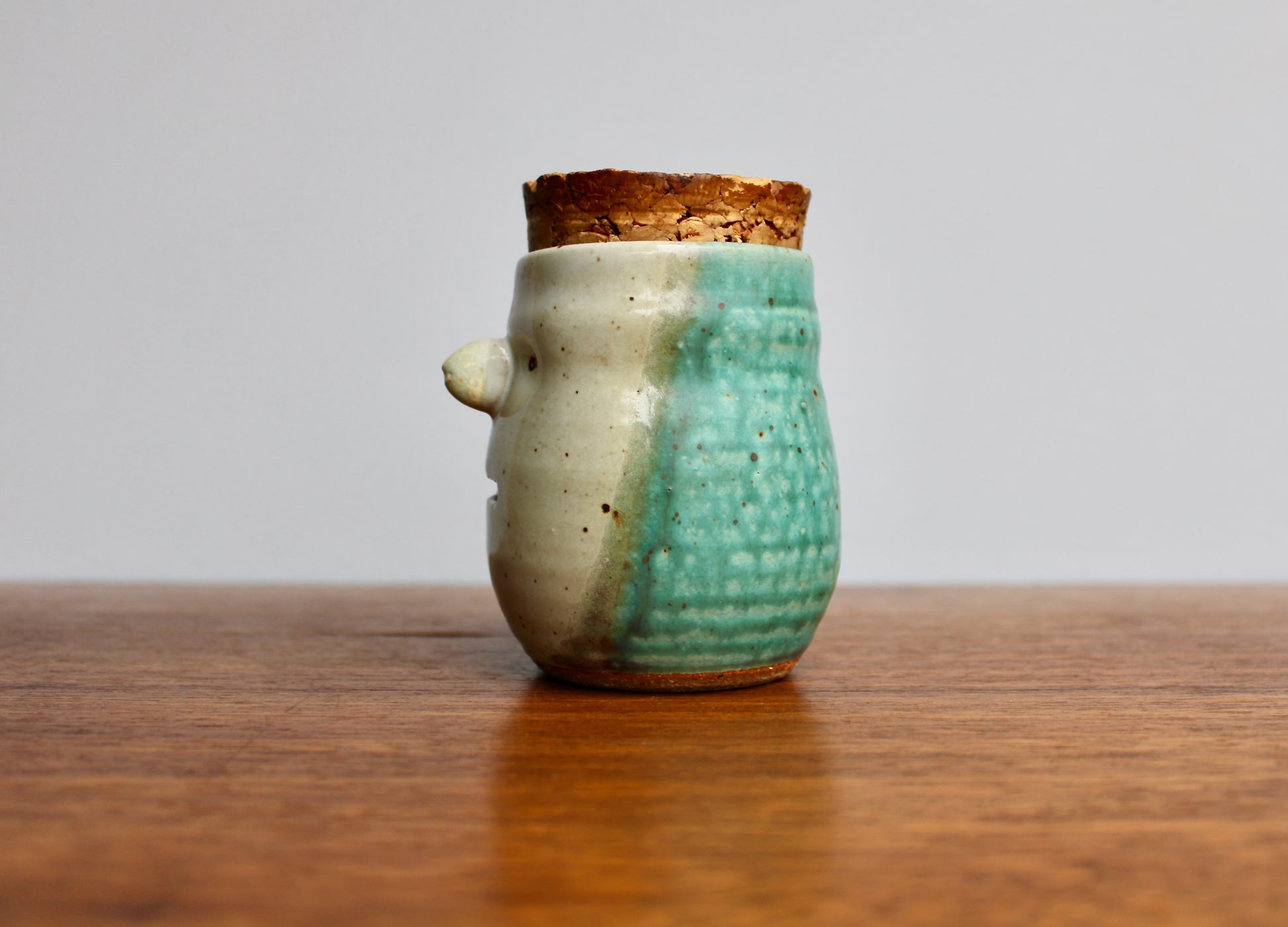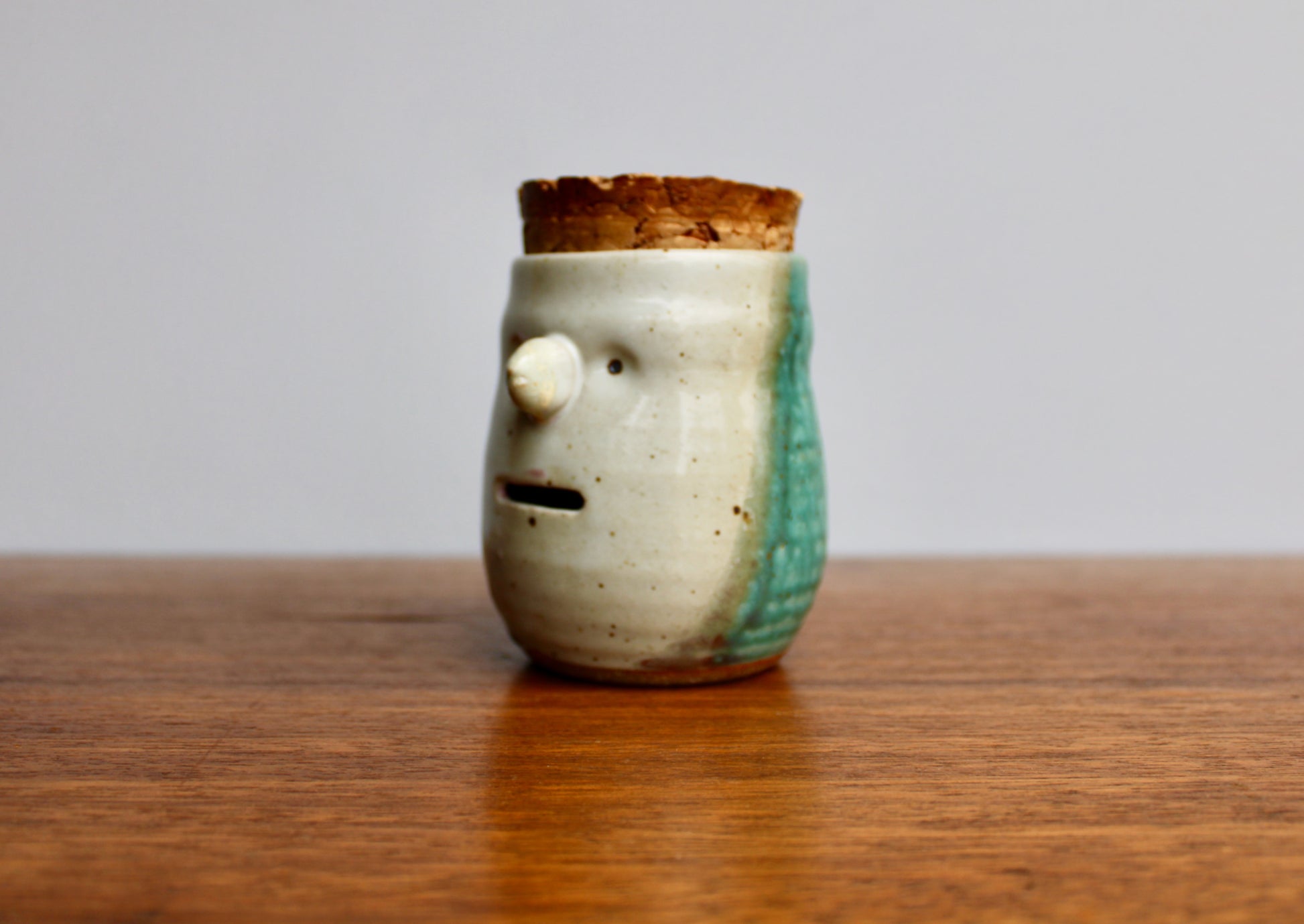 SOLD: Dual Purpose Pottery Face Jar w/ Natural Cork Lid, Egg Separator & Garlic Keeper, Functional Wheel Thrown Pottery, Crafted by Karen