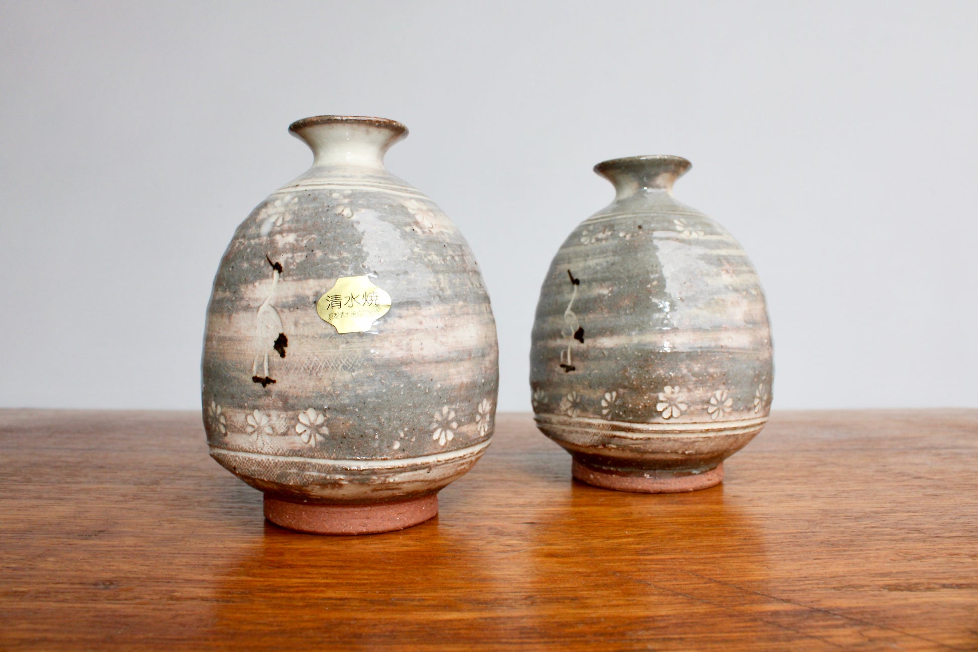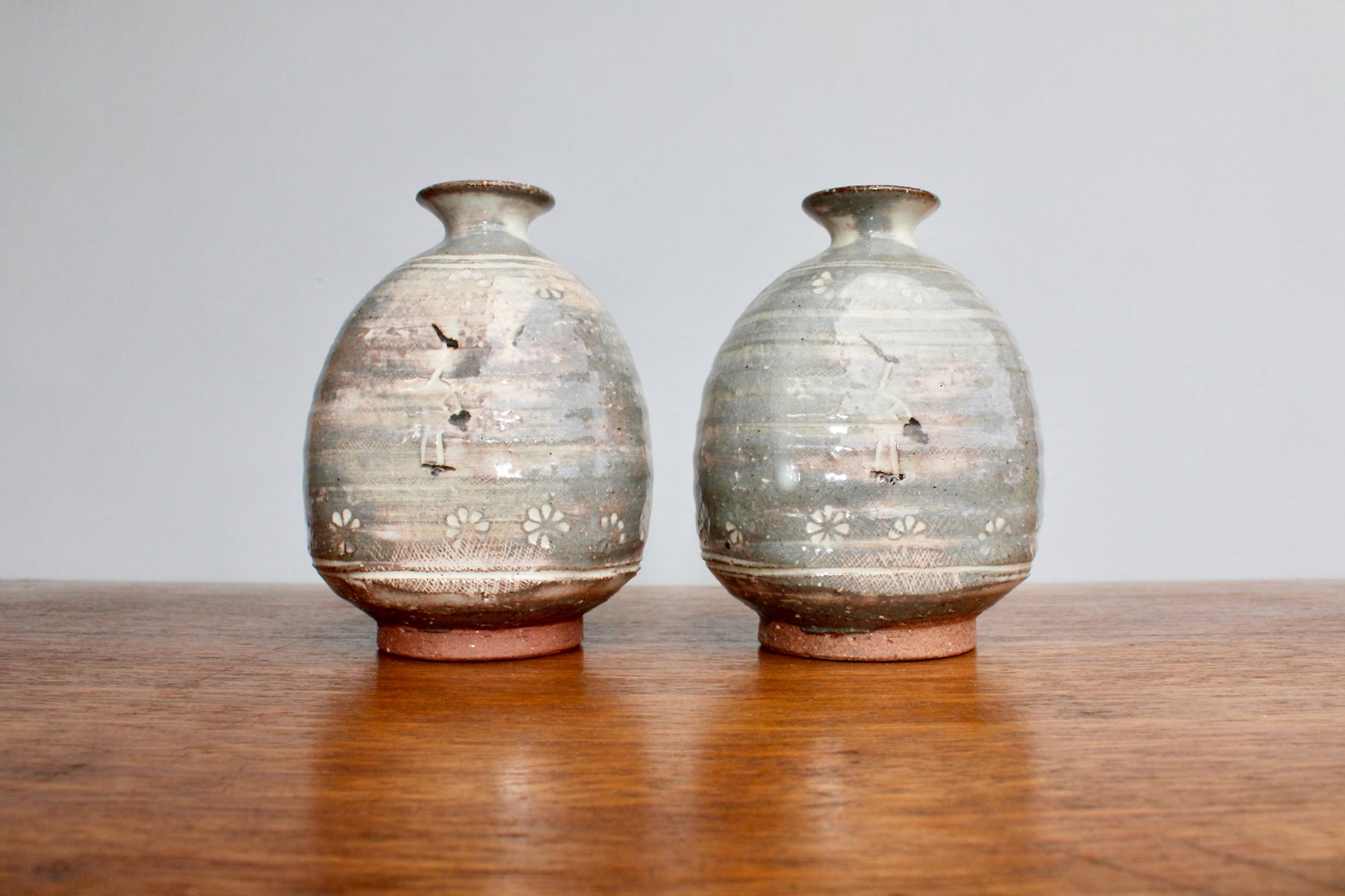 Pair of 4.5" tall Crane Weedpots, Handsome Kyo Kiyomizu yaki ware, Kyoto Japan Mishima style Flower Stamped Decor w/ Cranes, Handcrafted in Japan