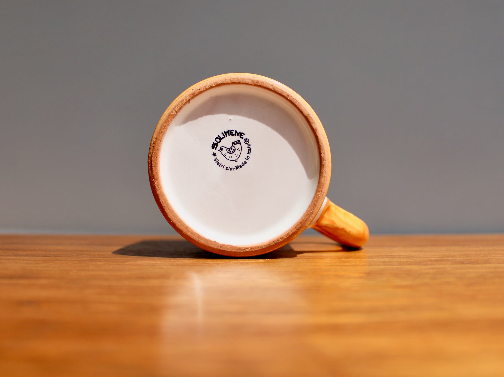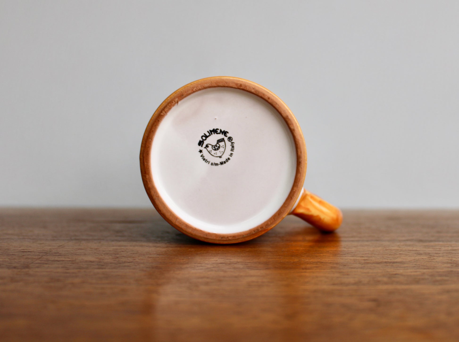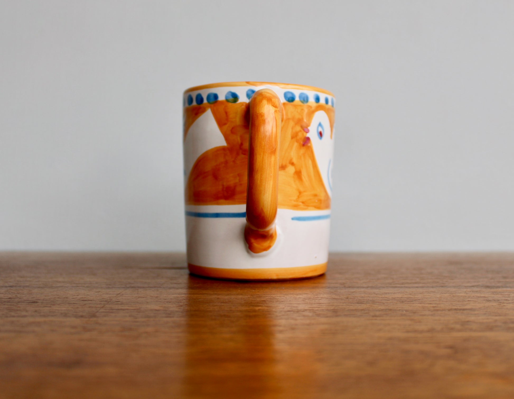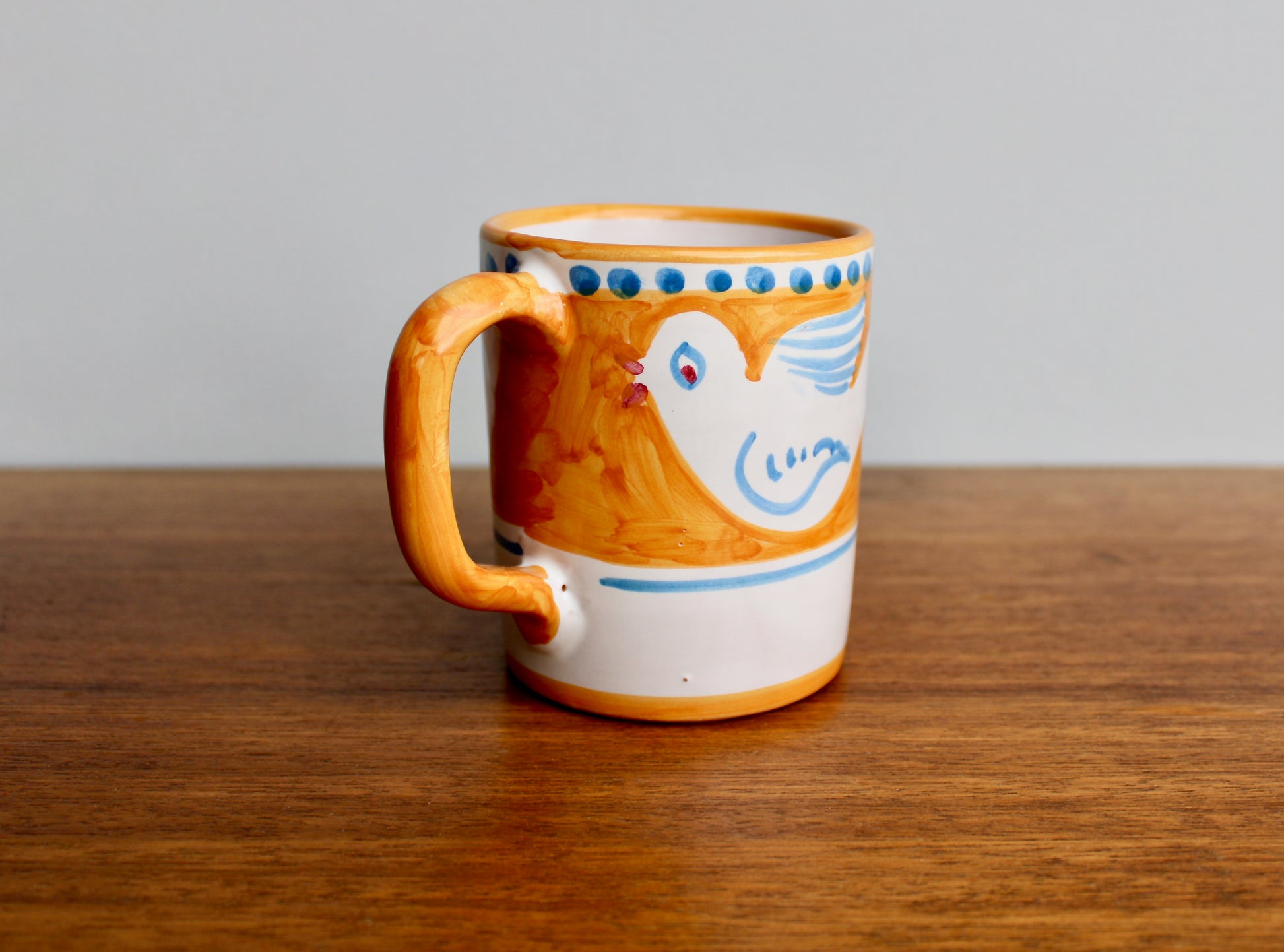 SOLD: 1984 Italy Vietri Mug in Campagna Bird (Uccello) Decoration - Yellow-Orange Mid Century Italy Earthenware