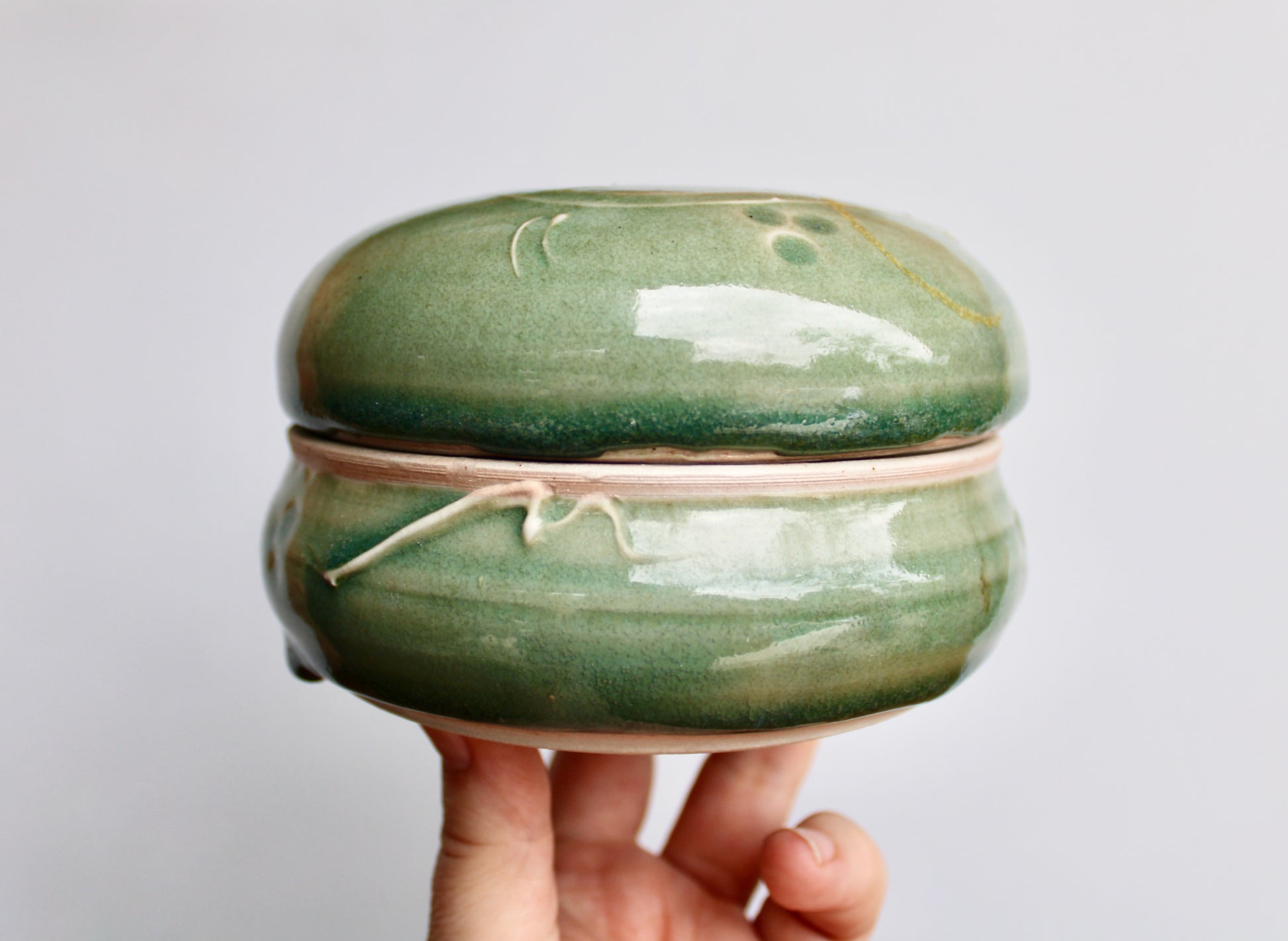 Scott Frankenberger Porcelain Celadon Box, Vtg Glossy Dimensional Glaze w/ Trapped Gold & Raised Decoration - Fine Studio Pottery, Signed & Sigil by Master Potter - 100% Handcrafted