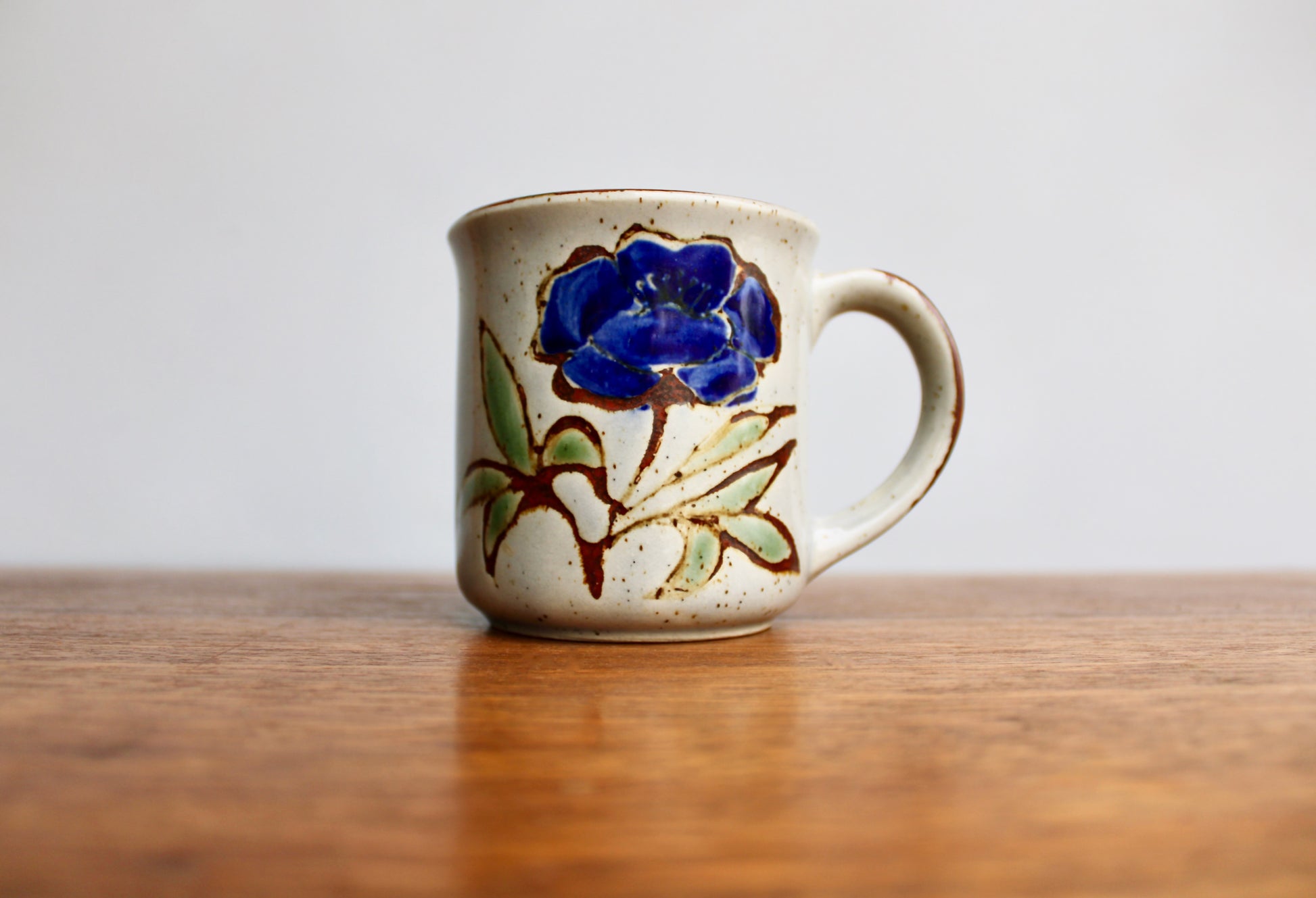 SOLD: 1970s Vtg Otagiri Mug, Huge Blue Flower - Color Literally Coming at You ! Classic Modern Japanese Pottery Vintage Tankard Style Coffee Mug