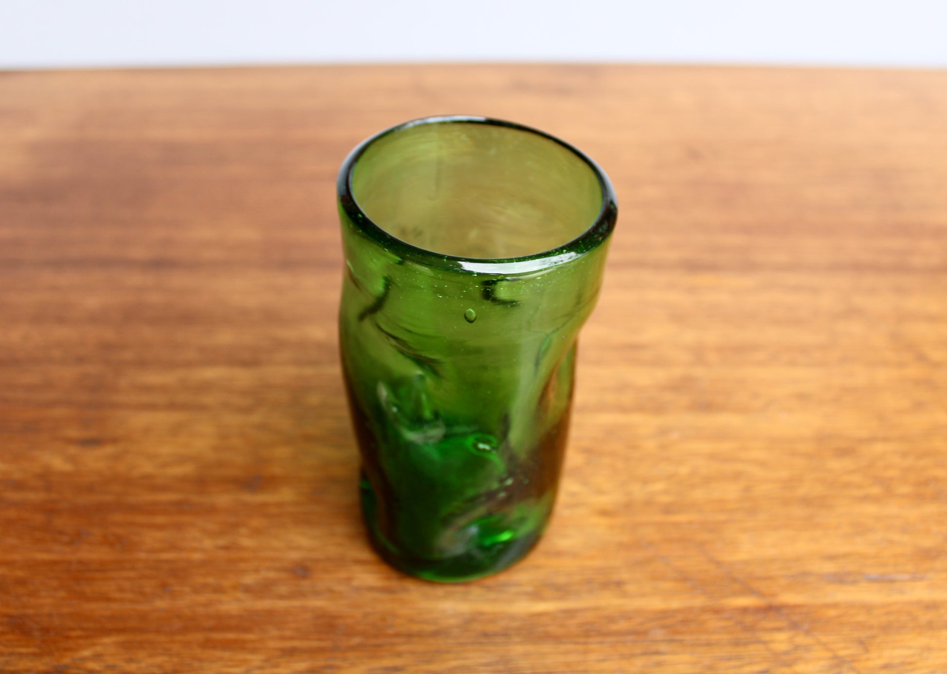 Blenko-Type 418S Clover Green Dimpled Tumbler, 5" Handcrafted Pinched Glass, 20th Century Mouth Blown Glass Tumbler